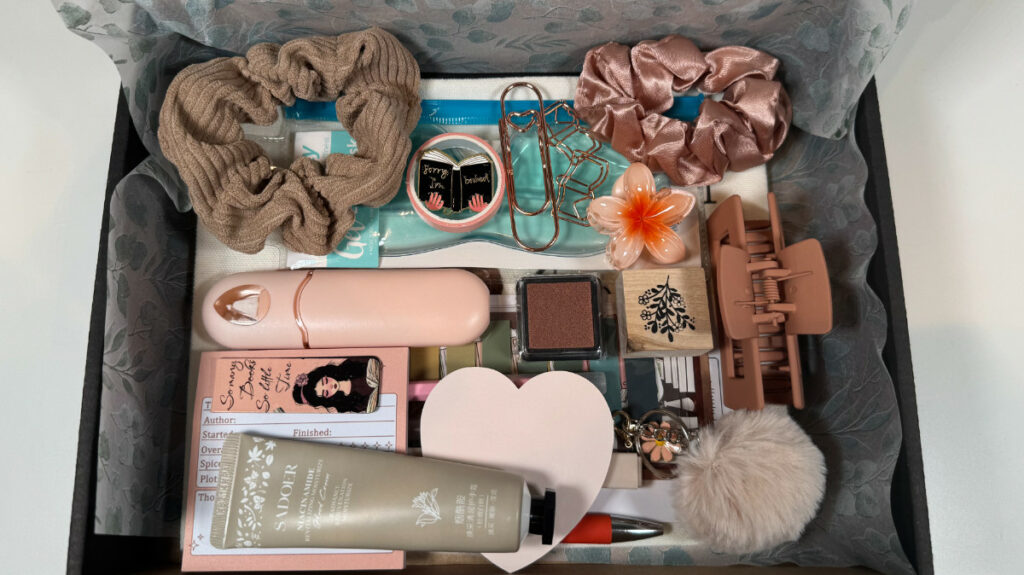 Every bundle includes a premium item – something more substantial like a tote bag, book sleeve, or book light. The rest? Completely random. Bookmarks in colours you’d never have chosen yourself. Stickers you didn’t know you wanted. Annotation tabs in themes that match perfectly.